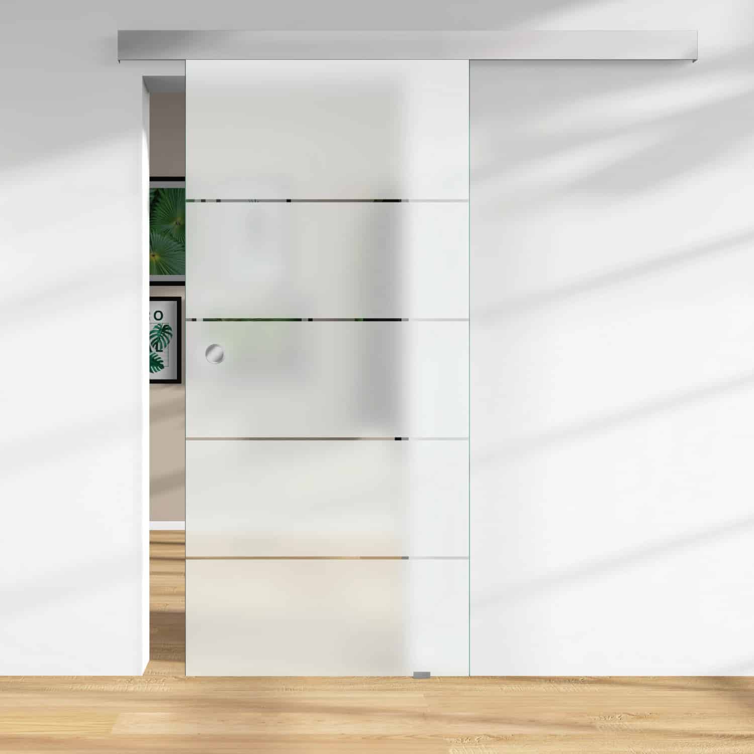 Die Glasschiebetür ESG Floatglas Dekor Siebdruck 36/38 DIN LI/RE 2060 x 940 x 8 mm ist vielseitig einsetzbar und lässt sich harmonisch in verschiedene Wohnbereiche integrieren.