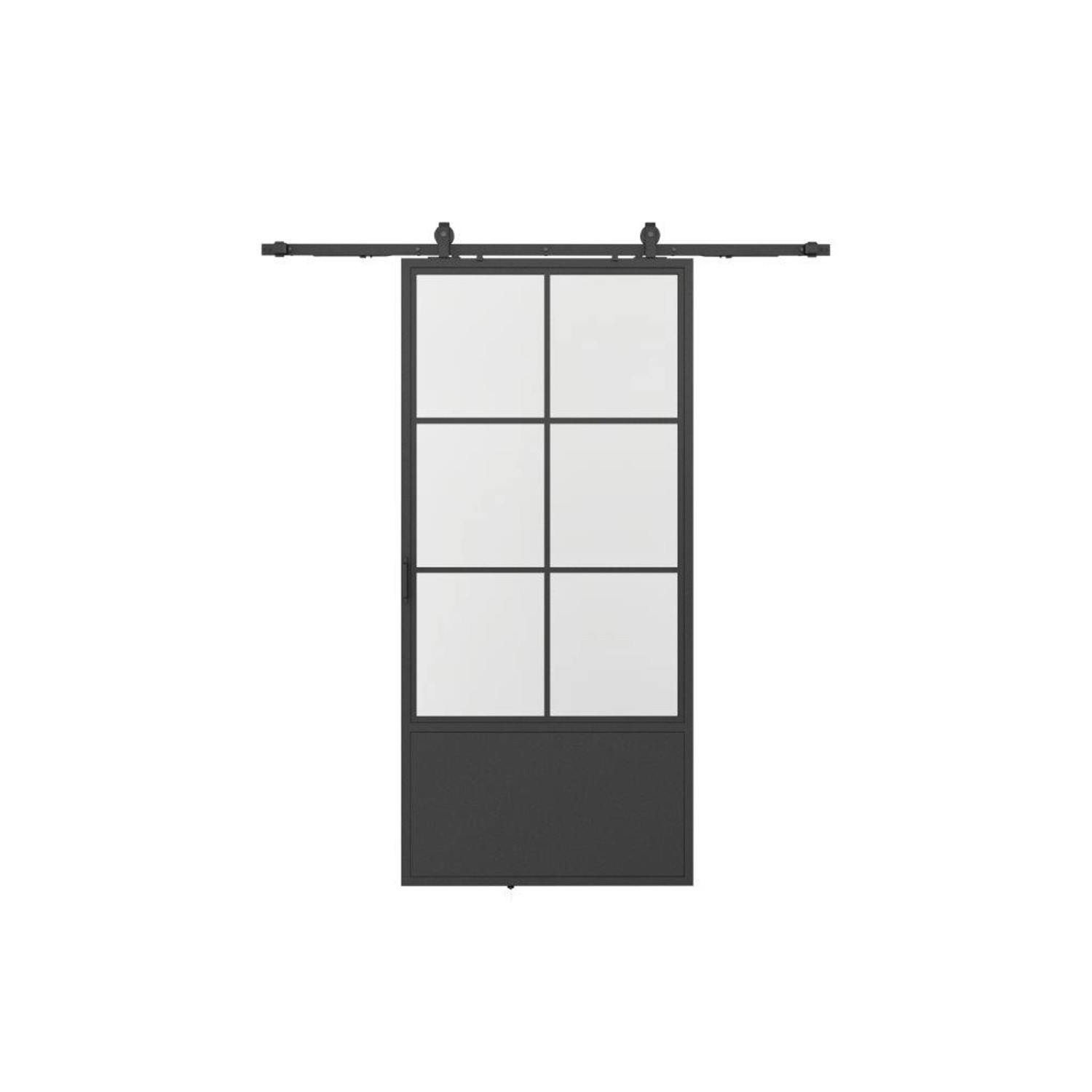 Der Lieferumfang der inova Loft Glasschiebetür umfasst: Die Glasschiebetür mit sechs Feldern, den Stahlrahmen in Schwarz, die Kickplatte aus Stahl in Schwarz, das beidseitige Softclose-System, die Laufschiene, die Griffe, das Montagematerial und eine detaillierte Montageanleitung.